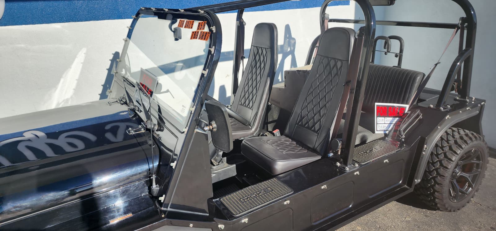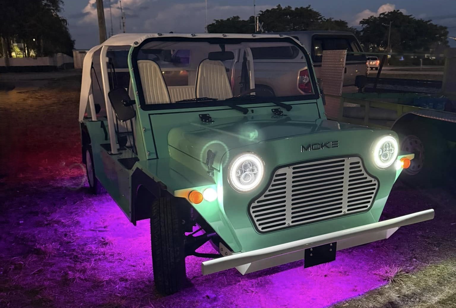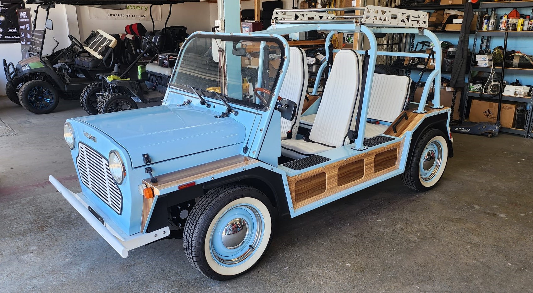 We upgrade MOKEs with Eco Lithium power systems that can be paired with Navitas controllers and/or high‑output AC motors, along with performance wheel and tire packages, custom‑stitched marine‑grade seating and tops, audiophile‑grade marine stereos, LED lighting packages and more!